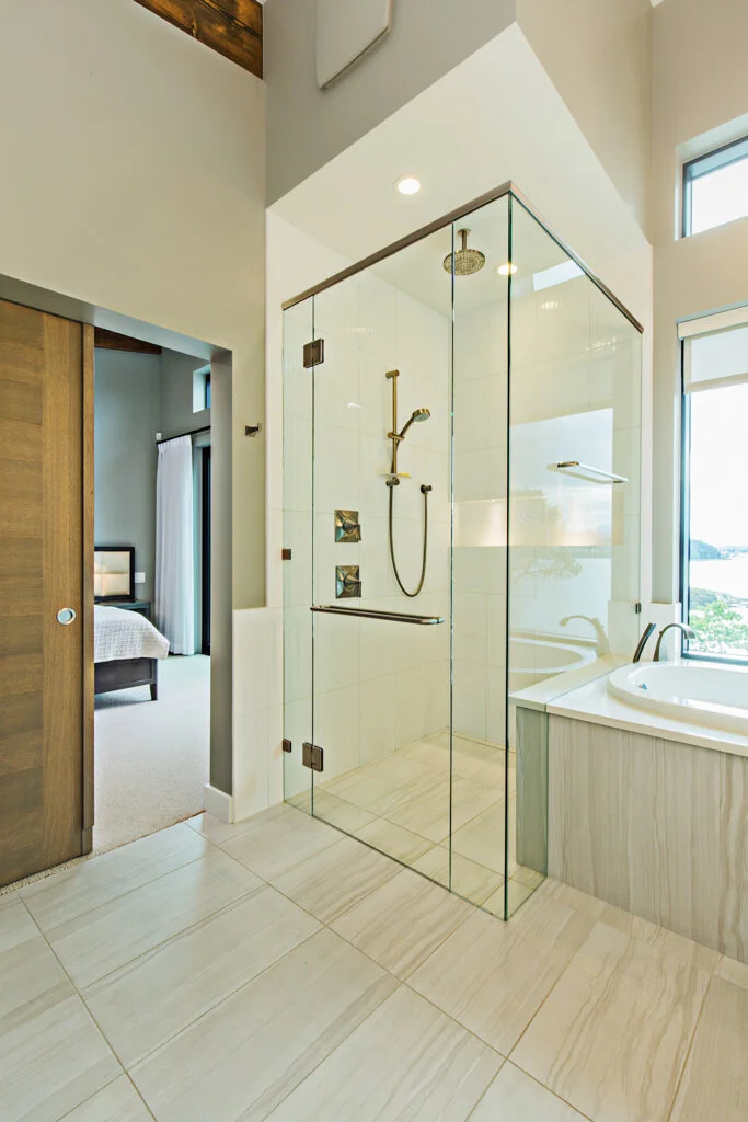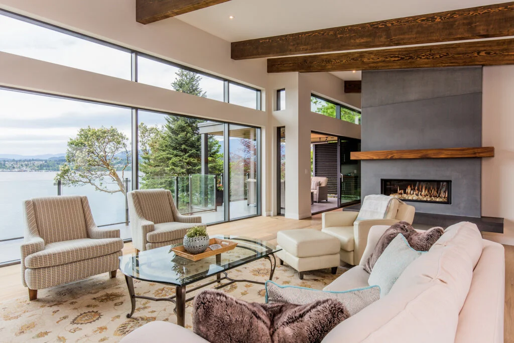 Seamlessly blending natural finishes with modern design, this West Coast home offers floor-to-ceiling windows that reach out to the breathtaking waterfront views.