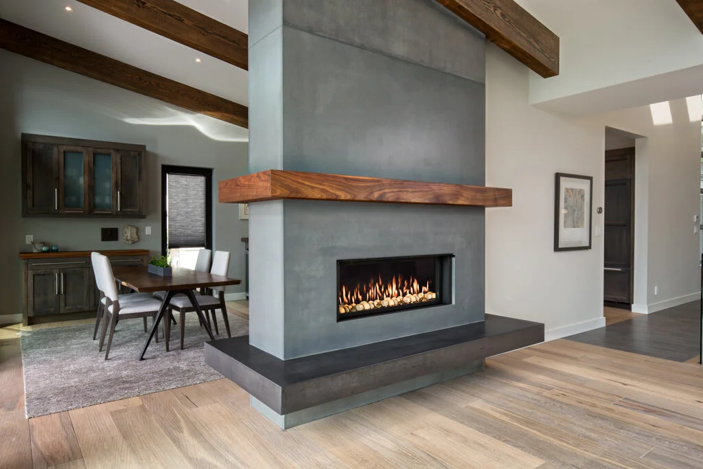 The rustic beams that grace the living spaces provide a warm, welcoming atmosphere, while the concrete double-sided fireplace serves as a stunning focal point that adds both visual interest and functionality.