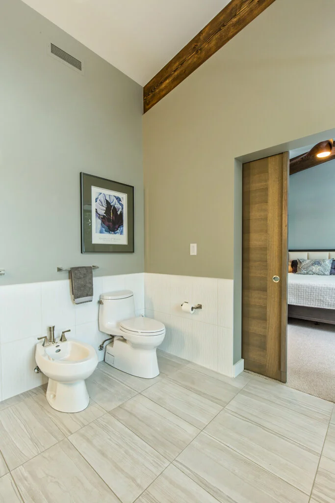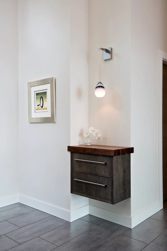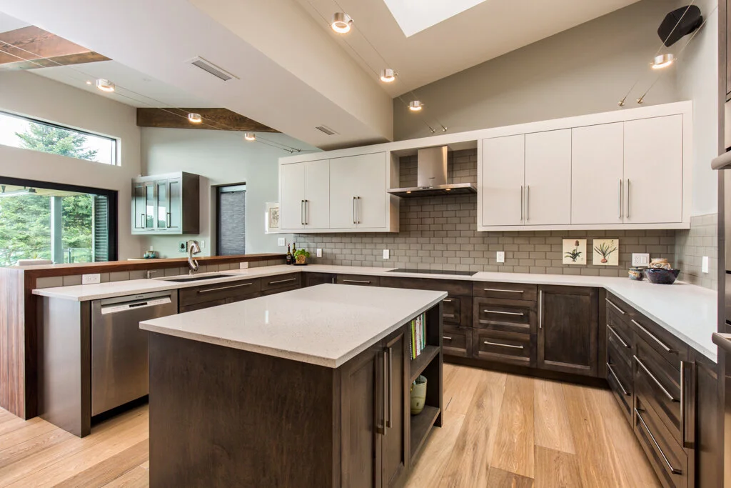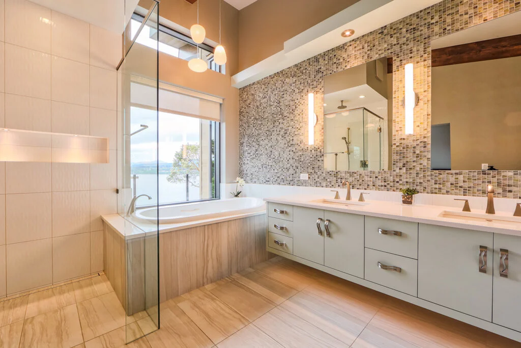 Situated on a sloping waterfront property, The Element features a unique butterfly roof that adds to its distinctive look and feel. The clean lines and natural finishes of the exterior are perfectly complemented by the sloping terrain and picturesque waterfront views.